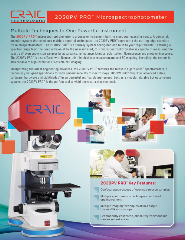 The 20/30 PV™ microspectrophotometer combines the latest technologies to allow the user to measure UV-visible-NIR range transmission, absorbance, reflectance, emission and fluorescence spectra of sample areas smaller than a micron across. Even the thickness of thin films and color spaces may be determined. And while microspectra™ are being acquired, the sample may be viewed with high-resolution digital imaging in the deep UV, in color or in the near infrared. Ease of use features also add to the power of the 20/30 PV™ system and include everything from improvements in the instruments ergonomics to software to automation.