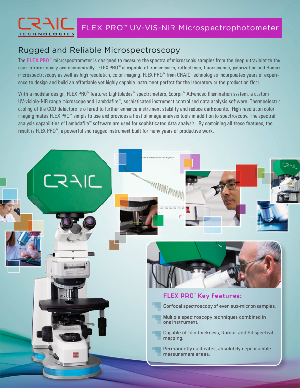 FLEX™ from CRAIC is a full-featured yet flexibly configured instrument that incorporates UV-visible-NIR optics, spectrophotometers digital imaging, and software...all tied together with our Lightswitch by CRAIC™ optical multiplexer. With our Lightswitch by CRAIC™ technology, FLEX™ retains the ease-of-use for which CRAIC instruments are known, while being capable of everything from UV-visible-NIR microspectroscopy, high resolution microscopic imaging, refractive index measurements and more.