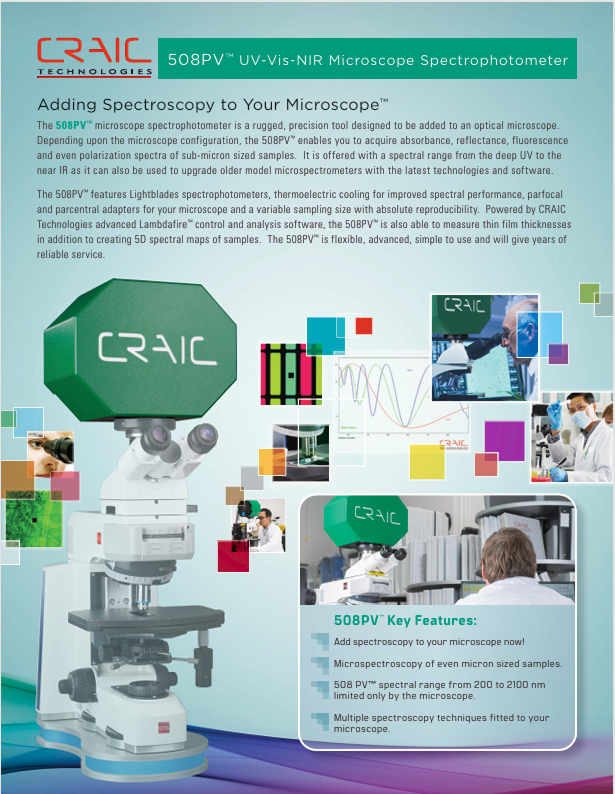 The 508 PV™ attaches to an open photoport and enables you to collect transmission, reflectance, polarization or even fluorescence and luminescence spectra of microscopic samples. Featuring Lightblades™ spectrophotometer technology from CRAIC, the 508 PV™ spectrophotometer has a usable spectral range from the ultraviolet to the near infrared. With the 508 PV™, you can acquire high quality spectra of even sub-micron samples rapidly, non-destructively and with ease.