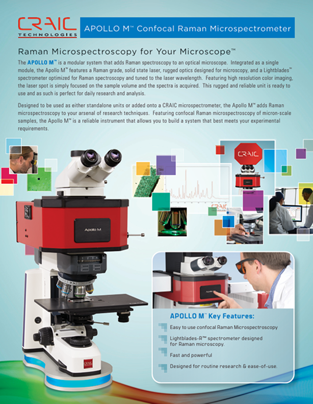 The CRAIC Apollo™ Raman spectrometer is designed for fast, easy micro-Raman spectroscopy so you can focus on sample measurements and results, not instrument setup. As such, it is perfect for routine research, quality control and failure analysis. The CRAIC Apollo™ Raman spectrometer employs optics, software and hardware all optimized for Raman spectroscopy of microscopic samples. The CRAIC Apollo™ Raman spectrometer is perfect for rapid, non-destructive analysis in fields such as life sciences, materials science, chemistry and physics.