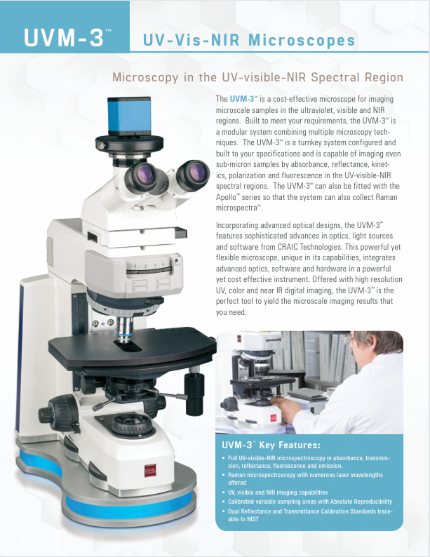 The UVM-1™ is a UV microscope that also can image in the visible and NIR. This UV-visible-NIR microscope embodies both advanced optics for cutting edge UV, color and NIR imaging and visualization. The system is a flexible design, very easy to use and very durable. It is designed with cutting edge CRAIC optics for the highest image quality and to give years of service.