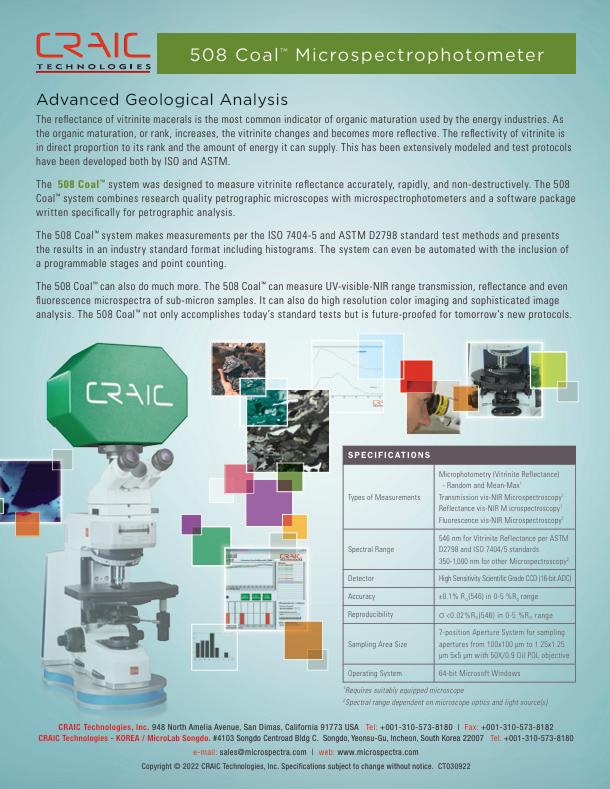 The CoalPro III™ Optical Petrography System from CRAIC Technologies is a microphotometer designed for the organic petrographic analysis using Standard Test Methodologies ISO 7404-5 and ASTM D2798. This microphotometer is configured to measure the reflectance from coals, kerogens and petroleum source rock. However, it also has a very flexible design. The CoalPro III™ was developed anticipating the next generation of test protocols as well as for fluorescence and micro-imaging.